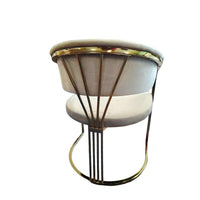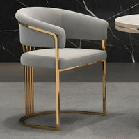 The upholstery fabric chair, in a sophisticated shade of grey offers a luxurious seating experience, while the sleek gold metal frame adds a touch of glamour. The chair's curved design and intricate details create a visually striking piece that will be the centerpiece of any room.