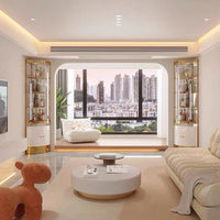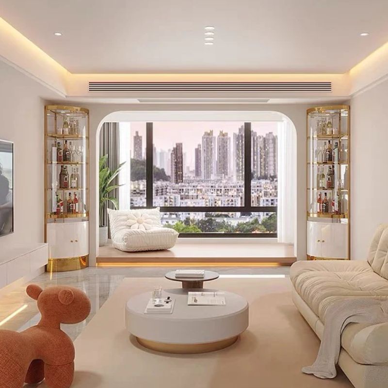 • Sleek Storage: The lower section features a rounded cabinet with High Gloss White (or Black) doors and subtle gold handles for discreet storage of bar accessories or essentials.